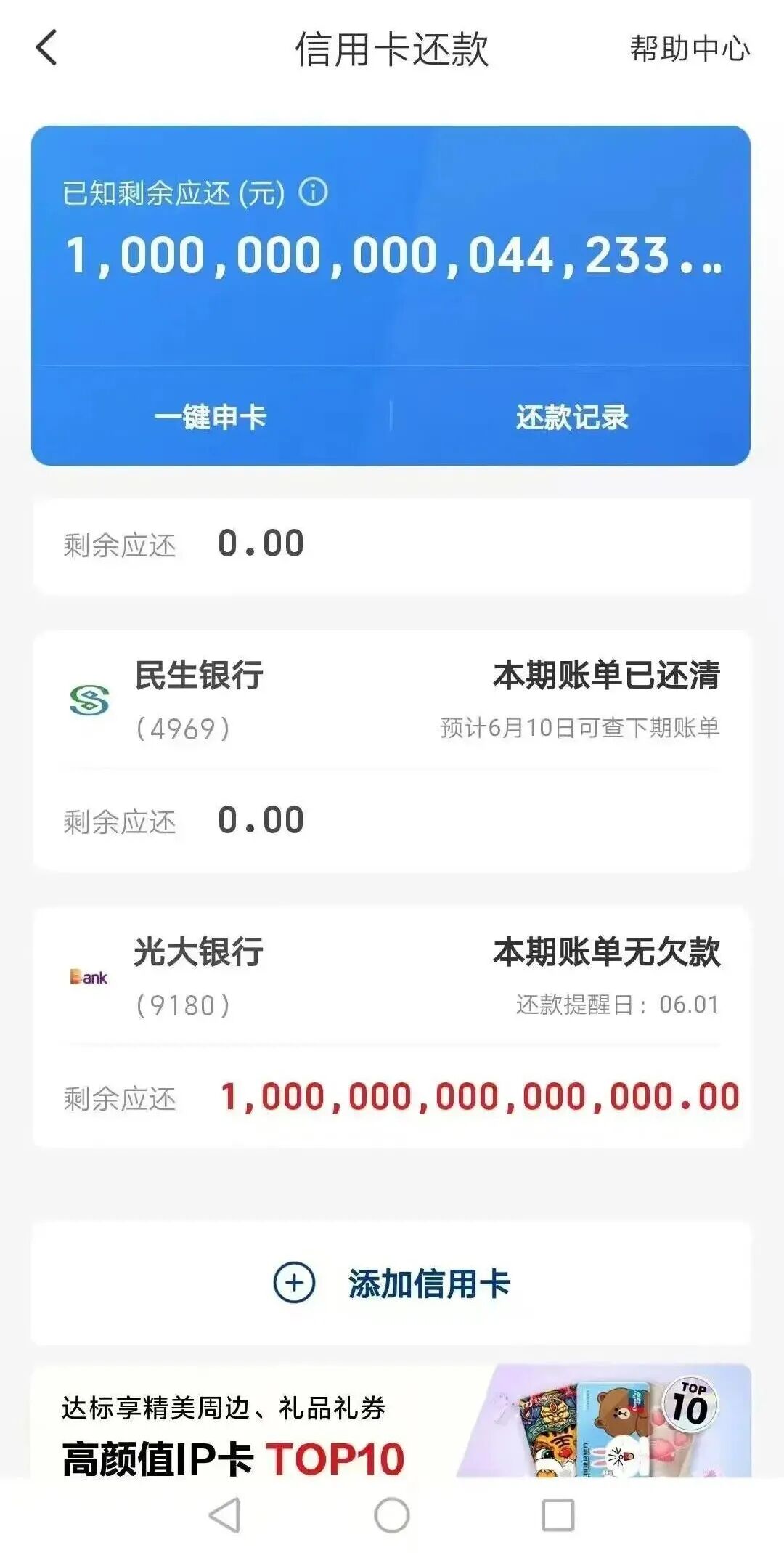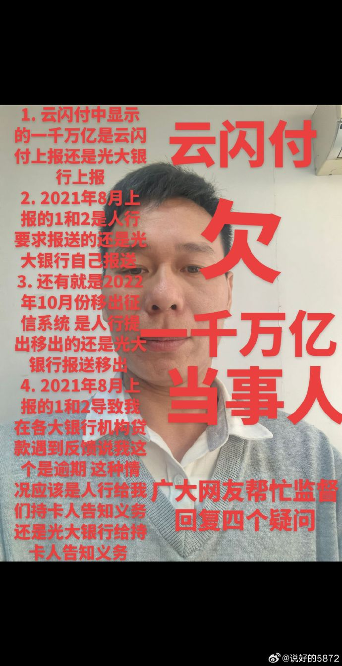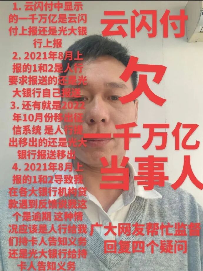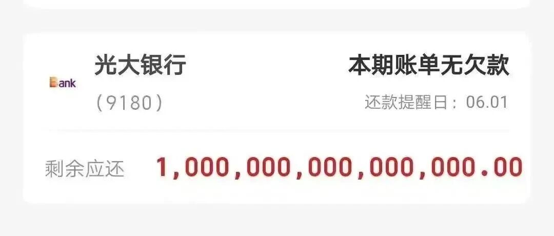 中山市美玉制衣有限公司老板覃先生近日在社交平台披露,他办理的光大银行“乐惠金”准贷记卡,在多年正常使用、无逾期还款的情况下,竟被云闪付App错误显示欠款1000万亿。这一荒诞数字导致覃先生“征信异常”,自2022年起,他向多家银行申请贷款均遭拒。他困惑之下得知,问题源于2015年办理的这张卡在征信报告中被标记为逾期31至60天,而他坚称从未逾期。