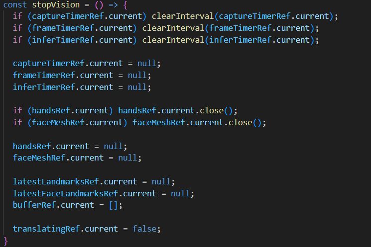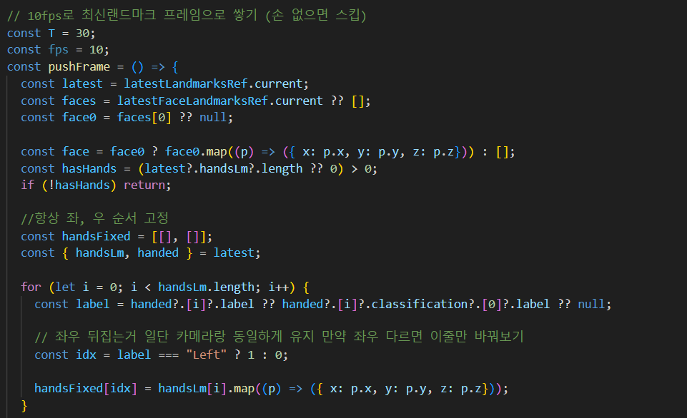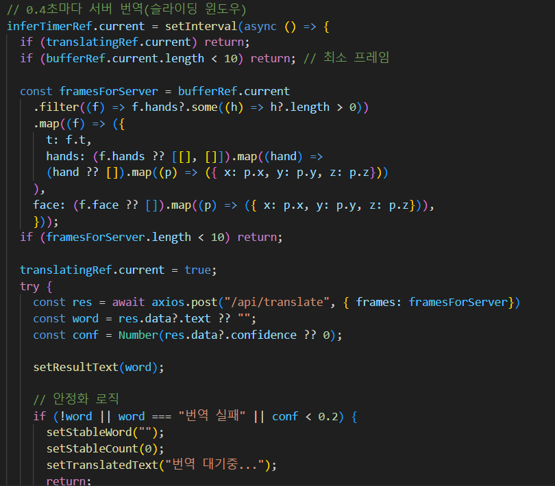 10fps로 최신 랜드마크 프레임으로 쌓기, 0.4초마다 서버 번역, 안정화 로직 등 Camera로 얻는 랜드마크 거의 옮겨옴