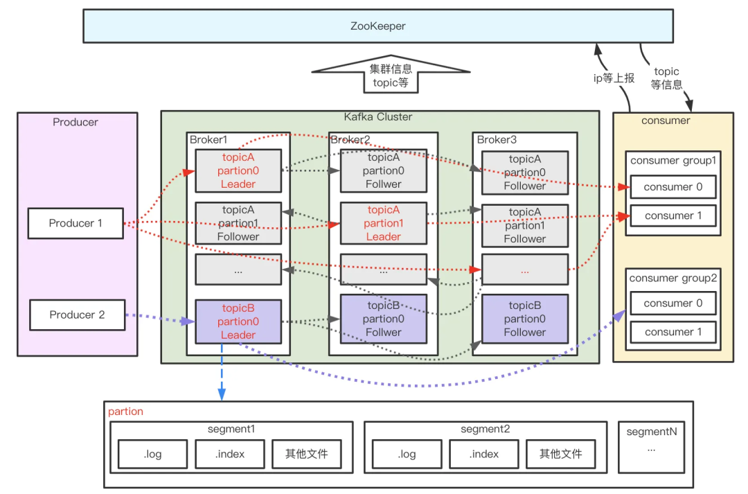 如上图所示,Kafka由Producer、Broker、Consumer 以及负责集群管理的 ZooKeeper 组成,各部分功能如下: