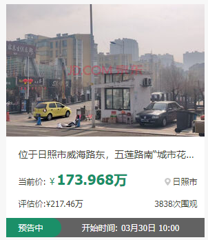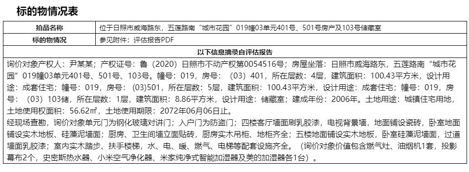 日照市东港区人民法院将于2026年3月30日10时至3月31日10时在京东网司法拍卖平台公开拍卖位于日照市威海路东、五莲路南"城市花园"019幢03单元401号、501号房产及103号储藏室。该房产为金海岸小学旁200多平米2层复式,评估价217.46万元,起拍价173.968万元,保证金9万元,增价幅度6000元。评估机构为山东蓝色经济区产权交易有限公司。竞买人需在竞价前仔细阅读拍卖公告及须知。法院咨询电话:王法官0633-8179311,京东网技术咨询电话4006229586,举报监督电话0633-8179265。拍卖辅助机构为山东司辅网络信息服务有限公司。公告发布日期为2026年2月24日。
