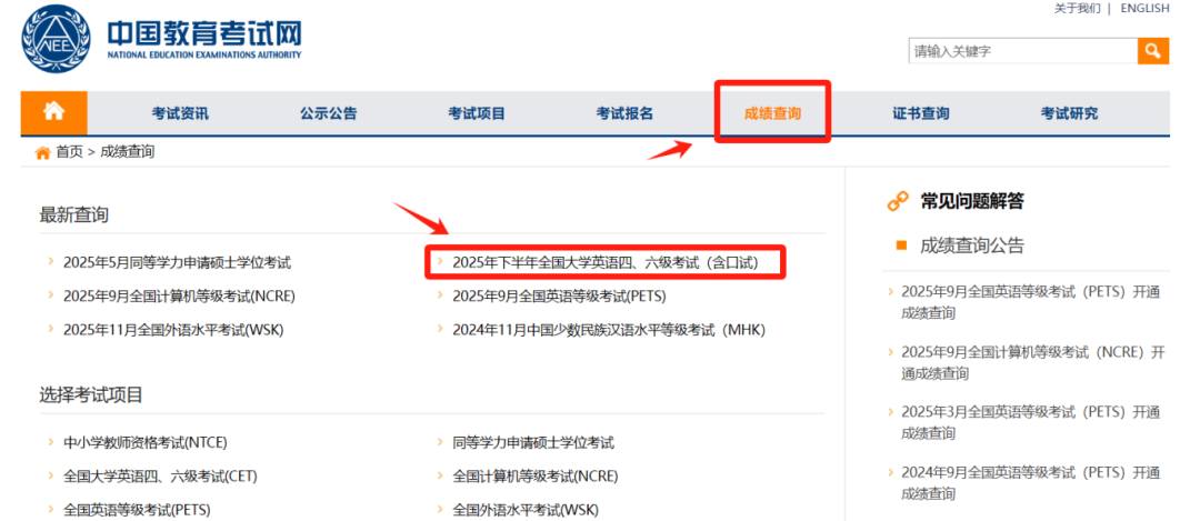 查询流程如下:首先进入中国教育考试网官网,点击成绩查询,选择2025年下半年全国大学英语四、六级考试(含口试)。跳转页面后,在2月27日6点后输入考试科目、姓名、准考证号,点击查询即可获取成绩。