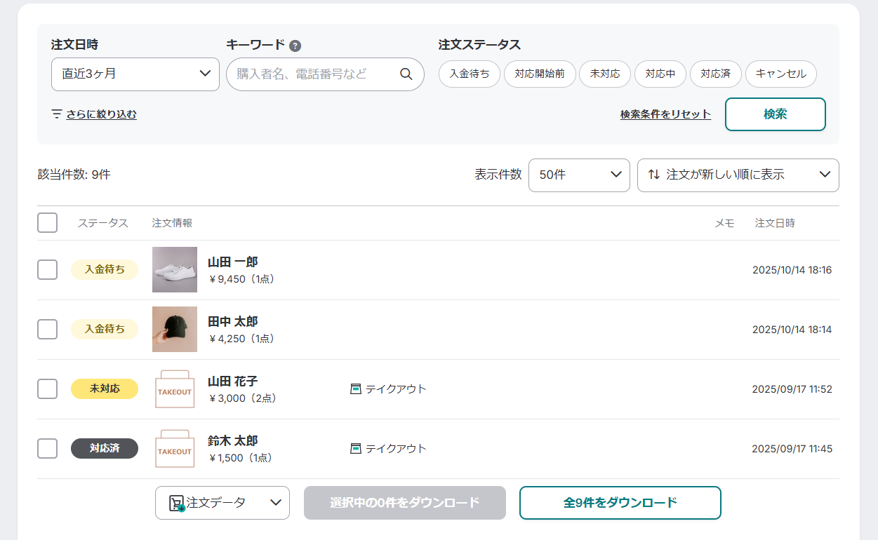 検索結果すべての注文データをダウンロードする場合は、「全◯件の注文をダウンロード」をクリックします。