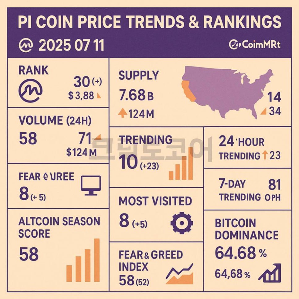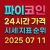 암호화폐 정보 사이트인 코인마켓캡의 2025년 7월 11일 오전 9시 00분 데이터 기준 파이코인은 시가총액은 전일 30위에서 30위입니다.(35.97억 달러에서 38.76억 달러)