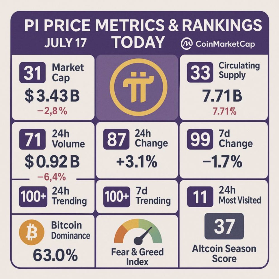 파이코인 시세 요약 인포그래픽, 2025년 7월 17일 기준 데이터 시각화
