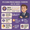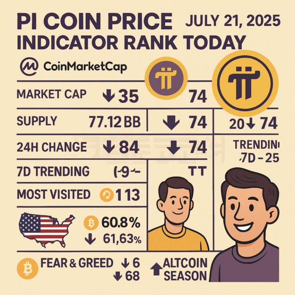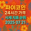오늘 파이코인 가격 시세 지표 순위 2025 07 21 - 암호화폐 정보 사이트인 코인마켓캡의 2025년 7월 21일 오전 9시 00분 데이터 기준 파이코인은 시가총액은 전일 34위에서 35위입니다.(전일 34.68억 달러에서 34.44억 달러)