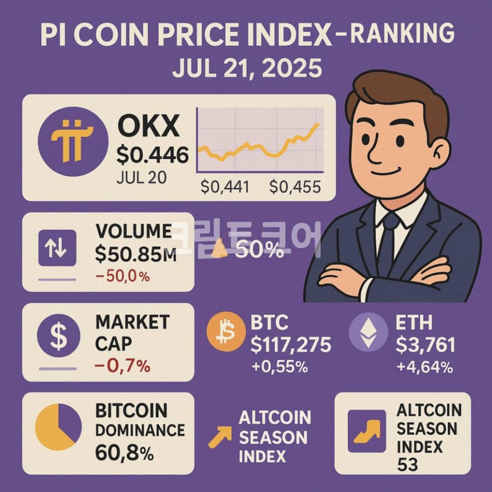 오늘 파이코인 가격 시세 지표 순위 - 2025 07 21 - 2025년 7월 20일 오전 9시 0.444 달러였던 OKX 기준 파이코인(PI) 가격은 7월 21일 오전 9시 0.446달러로 횡보하였습니다. 24시간 최저가는 0.441 달러, 최고가는 0.455달러입니다. 여기에 24시간 거래대금 5,085만 달러, 시가총액 34.4억 달러가 집계돼 전일 대비 각각 ‑50%·‑0.7% 소폭 감소하였으며 일간 변동 폭(+1.6%)은 비트코인(+0.55%, 117,275 달러)과 이더리움(+4.64%, 3,761 달러)보다 좁았습니다. 특히 비트코인 도미넌스가 60.85%로 내려온 가운데(‑0.78pp) 알트코인 시즌 지수가 53으로 반등해, 파이코인의 미약한 반등은 대형 알트 강세 흐름과 다소 동조화되었으나 강도는 제한적이었다고 해석됩니다.