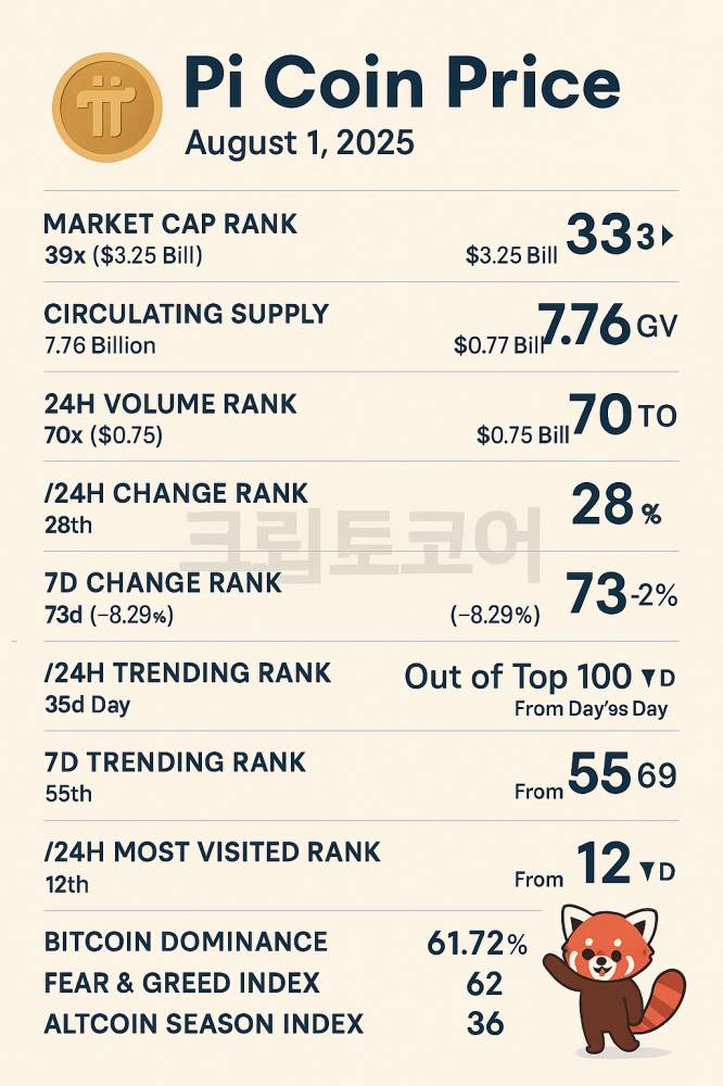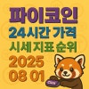 오늘 파이코인 가격 시세 지표 순위 2025 08 01 - 암호화폐 정보 사이트인 코인마켓캡의 2025년 8월 1일 오전 9시 00분 데이터 기준 파이코인은 시가총액은 전일 35위에서 33위입니다.(32.5억 달러에서 31.75억 달러)