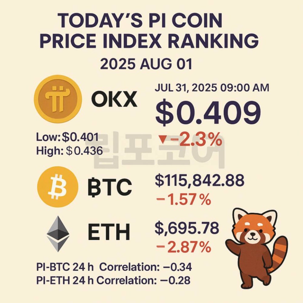 오늘 파이코인 가격 시세 지표 순위 - 2025 08 01 - 2025년 7월 31일 오전 9시 0.419 달러였던 OKX 기준 파이코인(PI) 가격은 8월 1일 오전 9시 0.409달러로 2.3% 하락하였습니다. 24시간 최저가는 0.401 달러, 최고가는 0.436달러입니다. 같은 기간 비트코인은 115,842.88 달러(-1.57 %), 변동폭 115,819.79 ↔ 118,919.98 달러, 이더리움은 3,695.78 달러(-2.87 %), 변동폭 3,685.00 ↔ 3,877.47 달러로 모두 약세였습니다. PI-BTC 24시간 상관계수는 -0.34, PI-ETH 상관계수는 -0.28로 디커플링 성향이 나타났습니다.