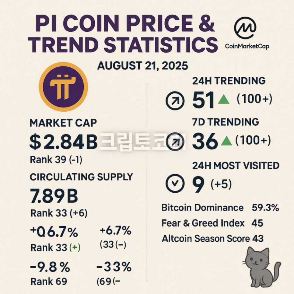 오늘 파이코인 가격 시세 지표 순위 2025 08 21- 암호화폐 정보 사이트인 코인마켓캡의 2025년 8월 21일 오전 9시 00분 데이터 기준 파이코인은 시가총액은 전일 38위에서 39위입니다.(27.07억 달러에서 28.48억 달러)