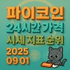 오늘 파이코인 가격 시세 지표 순위 2025 09 01- 암호화폐 정보 사이트인 코인마켓캡의 2025년 9월 01일 오전 9시 00분 데이터 기준 파이코인은 시가총액은 전일 26위에서 39위입니다.(31.34억 달러에서 28.8억 달러)