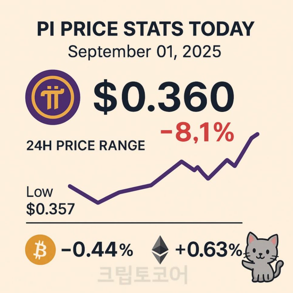 오늘 파이코인 가격 시세 지표 순위 - 2025 09 01 - 2025년 8월 31일 오전 9시 0.392 달러였던 OKX 기준 파이코인(PI) 가격은 9월 01일 오전 9시 0.360달러로 8.1% 하락하였습니다. 24시간 최저가는 0.357 달러, 최고가는 0.398달러입니다. 동시간대 코인마켓캡 기준 비트코인은 24시간 -0.44%, 이더리움은 +0.63%로 집계되어, PI의 낙폭이 시총 상위 대비 과대했습니다. 이는 24시간 고저폭(약 11.5%)이 큰 데 비해 회복 탄력이 약했음을 시사합니다. OKX 현물 호가도 0.358~0.360달러대에서 공방이 이어졌습니다. 시장 측면에서는 기관 수요가 여전히 유효하다는 데스크 리포트가 있었지만(9월 1일), 단기 방향성은 BTC·ETH 혼조 속 개별 재료가 부족한 알트 약세 구조가 유지되고 있습니다.