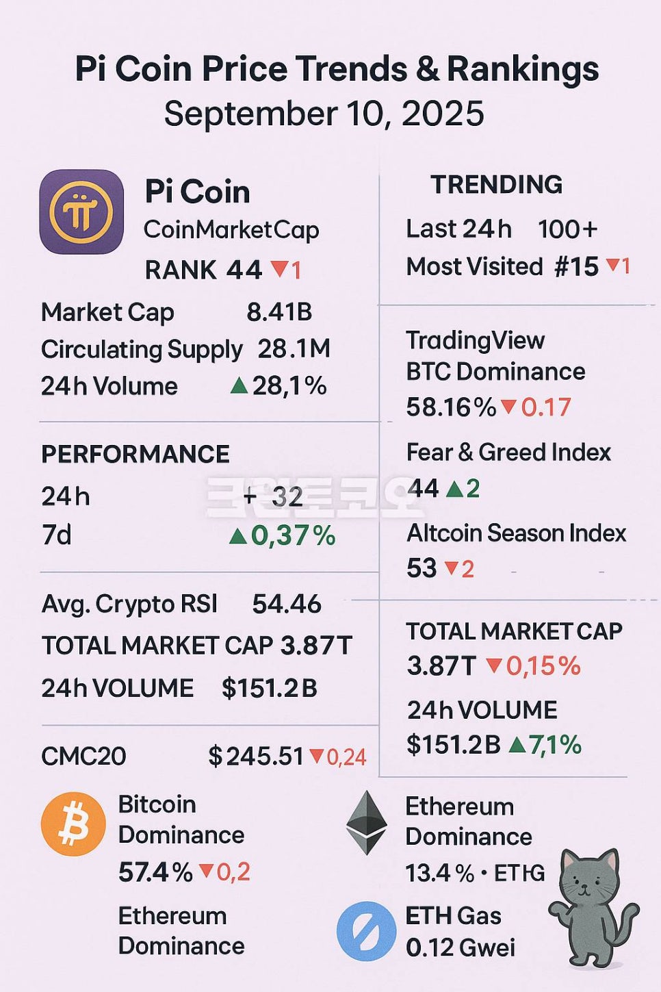 파이코인 가격과 시세 지표 변화를 요약한 2025년 9월 10일 암호화폐 시장 인포그래픽