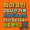 오늘 파이코인 가격 시세 지표 순위 2025 09 14- 암호화폐 정보 사이트인 코인마켓캡의 2025년 9월 14일 오전 9시 00분 데이터 기준 파이코인은 시가총액은 전일 43위에서 42위입니다.(29.06억 달러에서 30.39억 달러)