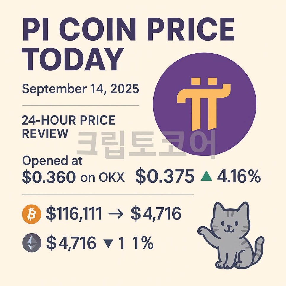오늘 파이코인 가격 시세 지표 순위 - 2025 09 14- 2025년 9월 13일 오전 9시 0.360 달러였던 OKX 기준 파이코인(PI) 가격은 9월 14일 오전 9시 0.375달러로 4.16% 상승하였습니다. 24시간 최저가는 0.358달러, 최고가는 0.377달러입니다. 비트코인은 116,111달러에서 115,954달러로 횡보하였고 이더리움은 4,716달러에서 4,668달러로 1% 하락하였습니다. 주말에는 구조적으로 거래량이 얇아지는 경향이 있어, 비트코인 횡보 대비 알트로 유동성이 순환될 때 PI가 상대 강세를 보이기 쉬운 환경이었습니다. 실제로 최근 주말엔 비트코인이 좁은 범위에서 움직인 사례가 반복 관찰되었습니다. 이더리움은 최근 4.7K선을 회복했다가 금일 1% 조정이 나타났는데, ETF 자금 유입 보도 등 중기 모멘텀은 유지되는 흐름입니다. 이러한 맥락에서 PI의 일중 고점(0.377달러) 근처에서는 단기 차익 실현, 저점(0.358달러) 부근에서는 되돌림 매수 시도가 교차하며 박스권 특성이 강화되었습니다.