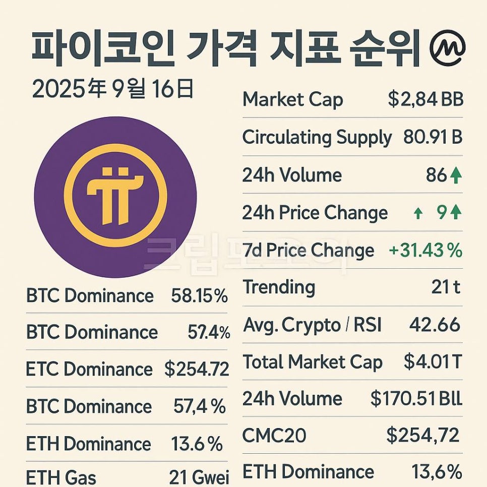 파이코인 시세 및 주요 암호화폐 지표를 보여주는 2025년 9월 16일자 인포그래픽