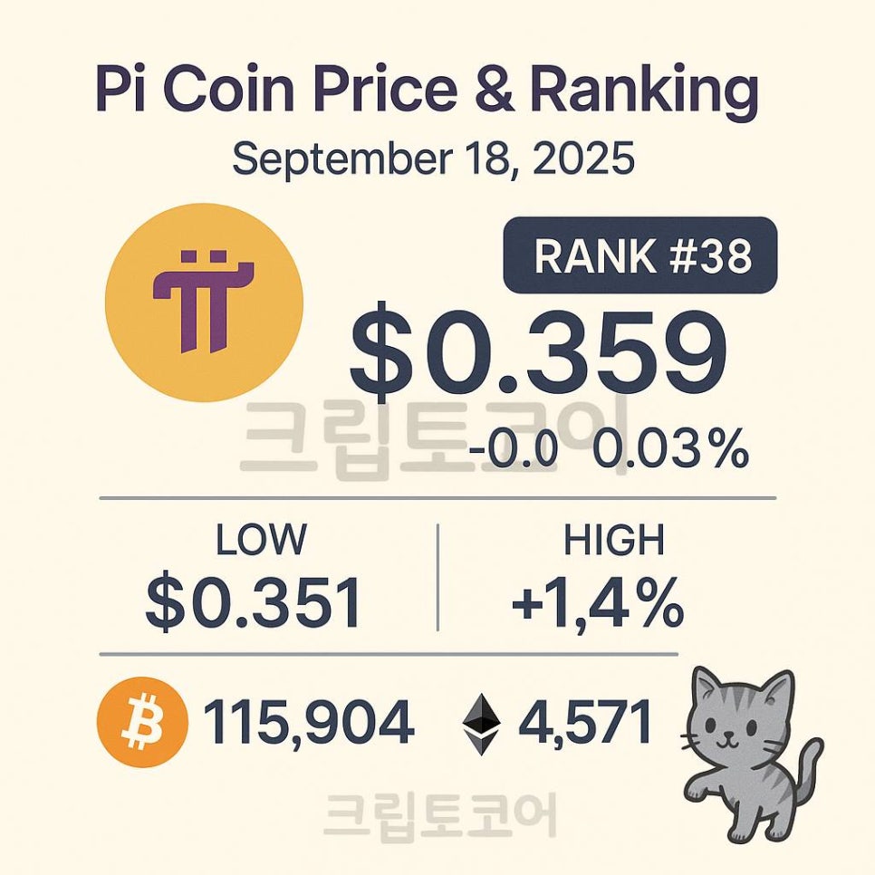 오늘 파이코인 가격 시세 지표 순위 2025년 9월 18일- 2025년 9월 17일 오전 9시 0.359 달러였던 OKX 기준 파이코인(PI) 가격은 9월 18일 오전 9시 0.359달러로 횡보하였습니다. 24시간 최저가는 0.351달러, 최고가는 0.362달러입니다. 동일 기준에서 비트코인은 116,849달러 → 115,904달러로 횡보, 이더리움은 4,505달러 → 4,571달러로 1.4% 상승하였습니다. 파이코인의 위 구간(0.351~0.362달러) 내에서 가격은 FOMC 금리 인하 발표(미 연준, 25bp 인하·기준금리 4.00~4.25% 범위로 하향) 전후에도 박스권을 유지했습니다. 직후 비트코인은 혼조 속 제한적 변동으로 마감했고(증시도 혼조), 금리 경로에 대한 해석이 엇갈리며 달러·채권 수익률은 탄력적으로 움직였습니다. 이는 알트 전반의 방향성을 잠시 모호하게 만들었고, PI 역시 비트코인 급등/급락에 동행하지 않는 ‘저베타 횡보’ 특성을 보였습니다. 상대 성과 측면에서는 같은 24시간 동안 BTC가 소폭 약보합, ETH는 +1.4%로 강세였기 때문에, PI는 ETH 대비 언더퍼폼·BTC 대비로는 거의 중립에 가까운 하루를 보낸 셈입니다. 연준의 ‘추가 인하 가능성’ 시사(점도표상 연내 2차례 추가 인하 전망)는 위험자산에는 중기적으로 우호적이나, 당일 직후 가격반응은 혼조였습니다.