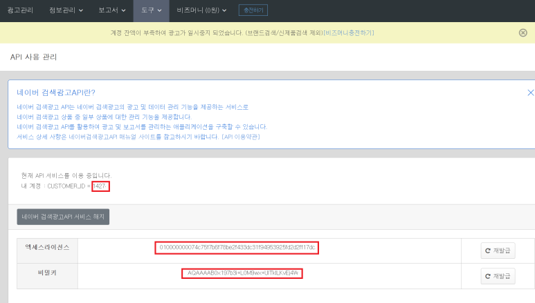 [네이버 검색광고 - 도구 - API 사용 관리]로 이동하여 정보 확인