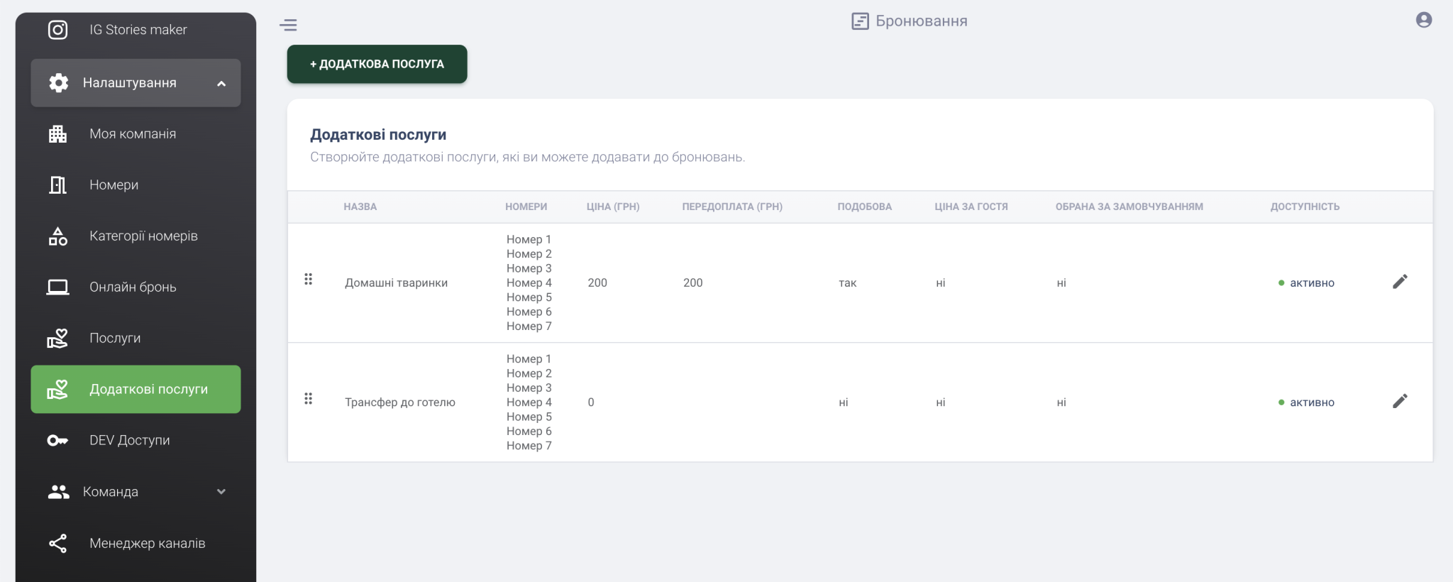 Щоб показати Гостю достаткові сервіси, які ваша компанія надає ви можете створювати «додаткові послуги».