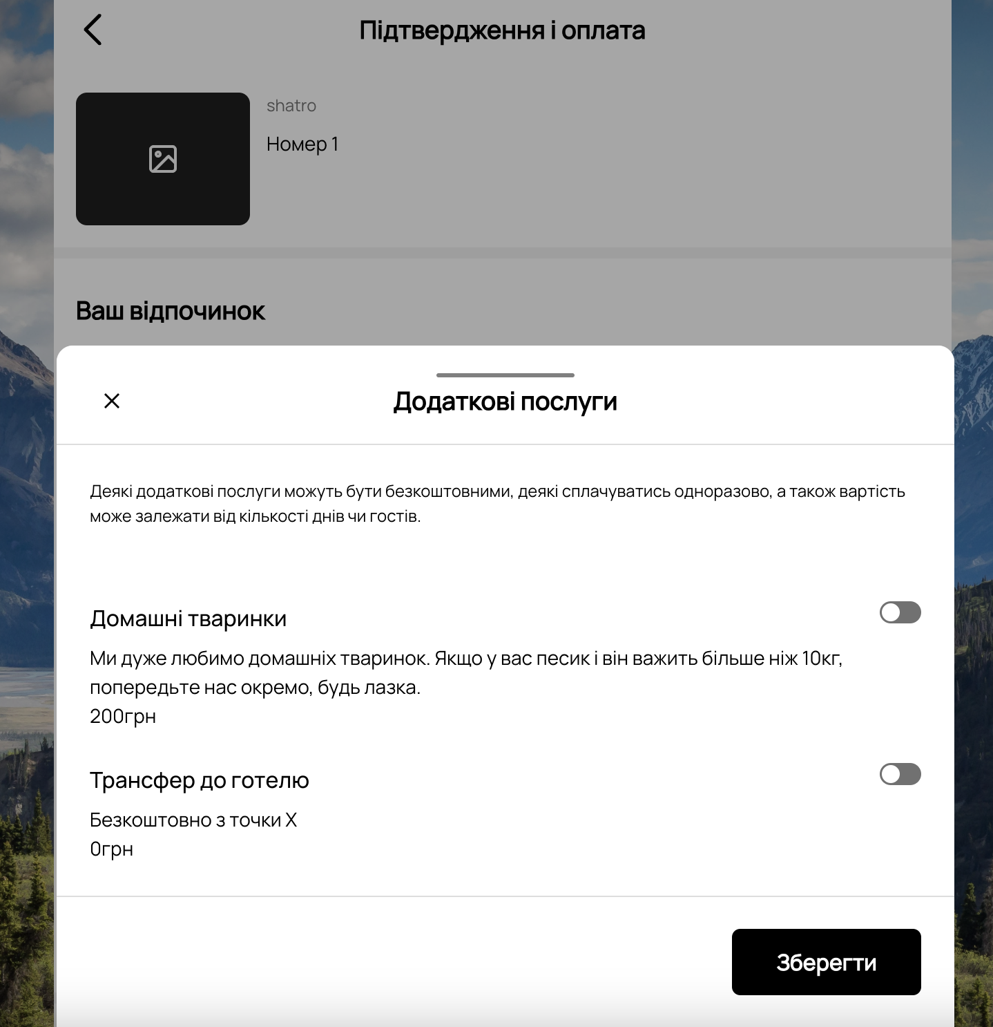 Бронюючи, Гість може обрати додаткові сервіси і одразу побачити, чи впливає це на вартість бронювання.
