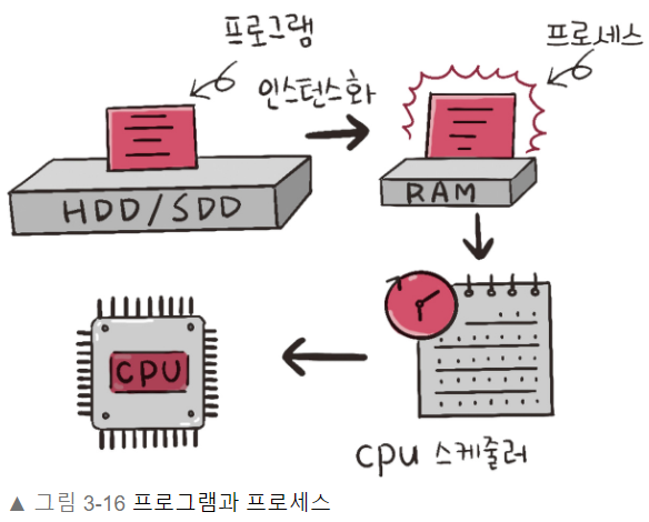 - 프로그램이 메모리에 올라가면 인스턴스화되어 프로세스가 됨
