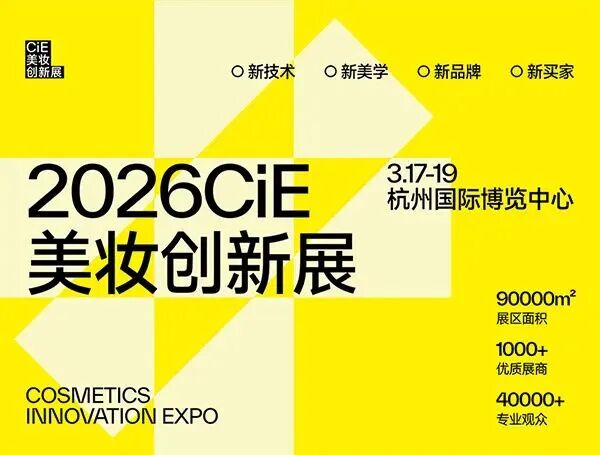2026杭州CiE美妆创新展(3月17-19日,杭州国际博览中心)邀请1000+家展商,涵盖新国货、进口品、原料包材,30+新品发布会,创意包装展区,红人盛典锁定美妆新趋势。免费领票。