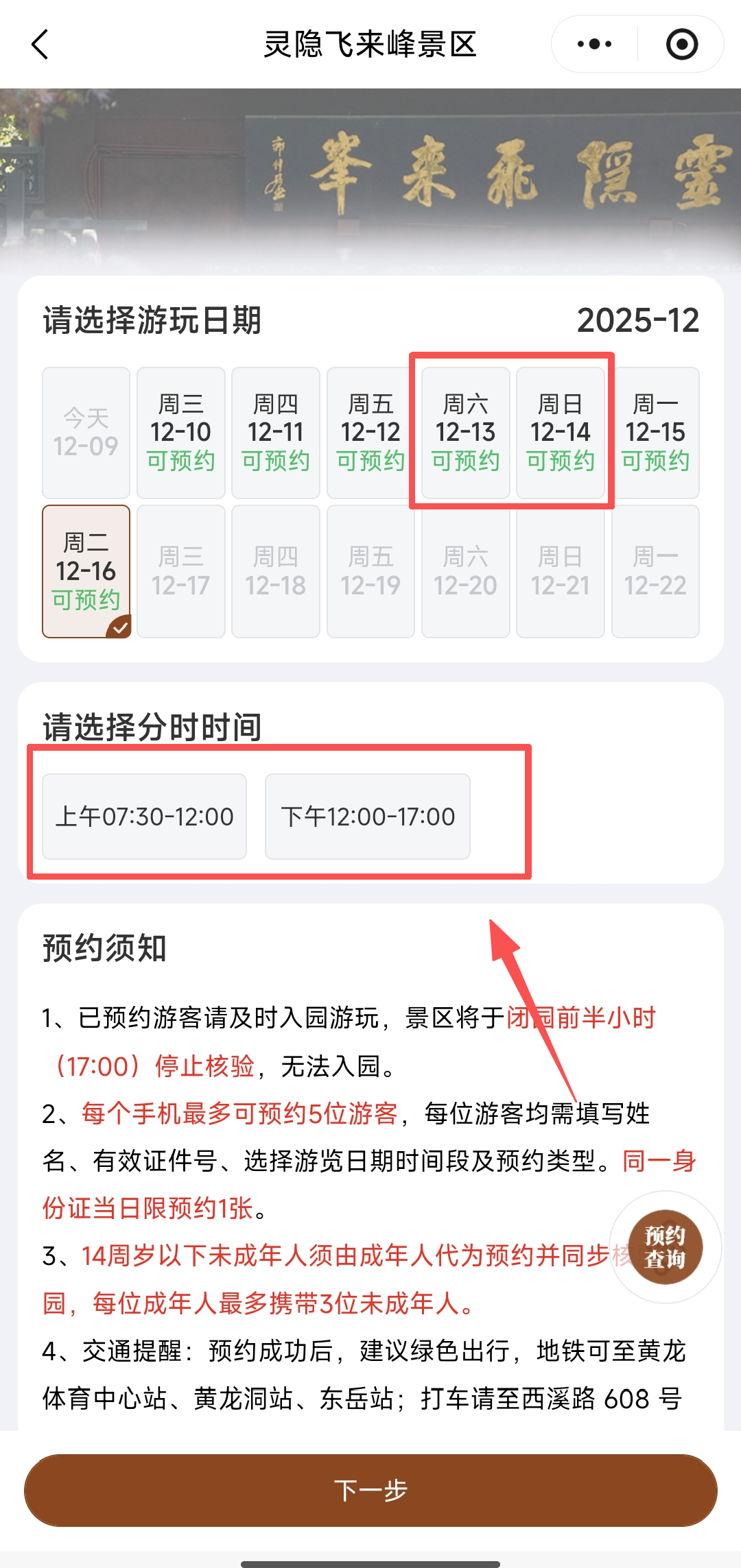 预约渠道为支付宝或微信搜索"杭州灵隐飞来峰"小程序。预约规则为至少提前1天预约未来7日名额,每人每证每日限约1次,每手机号最多约5人。分为上午场7:30-12:00和下午场12:00-17:00两个时段。
