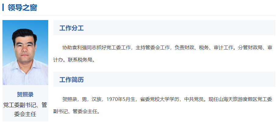 日照山海天旅游度假区领导班子迎来重要调整。根据山海天旅游度假区官网最新公布的领导信息,贺照录已正式出任党工委副书记、管委会主任职务。与此同时,原管委会主任袁利强已升任山海天党工委书记一职。
