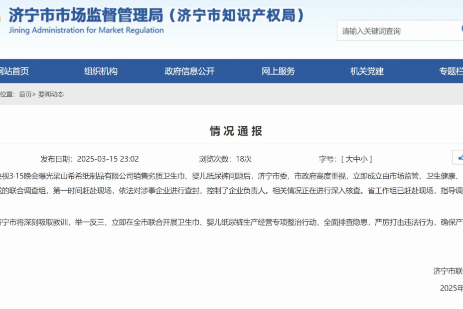 2025年3月15日央视晚会曝光梁山希希纸制品有限公司翻新卫生巾事件,该公司从苏菲、全棉时代等品牌收购残次品和生产垃圾进行二次包装售卖,年处理垃圾近两万吨。事件曝光后,青岛市市场监管局全面排查,确认本地无直接涉事生产企业。随即启动卫生用品专项执法行动,重点排查商超、便利店、批发市场及电商平台。共发现5家违规商户,其中2家销售无合格证明产品被立案查处并罚款,3家进货台账不规范被责令整改。同步开展全品类抽检、下架疑似问题产品、开通投诉绿色通道(3月15日至31日受理127起投诉,全部7个工作日内办结),并联合卫生健康委开展安全科普宣传。青岛市场监管部门以常态化监管守护消费者权益。