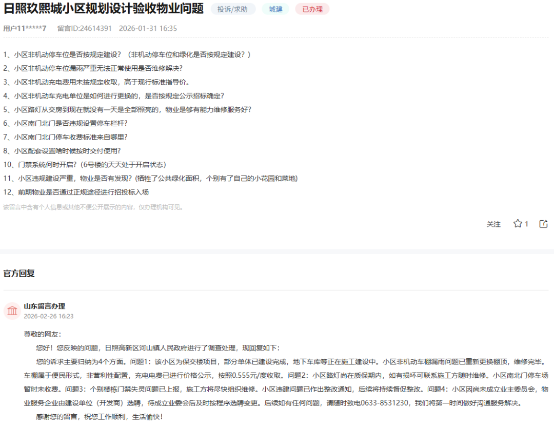 日照高新区河山镇人民政府回复称:该小区为保交楼项目,部分单体已建成,地下车库正在施工。非机动车棚漏雨问题已维修完毕,充电电费按0.555元/度收取并已公示。路灯尚在质保期内,如有损坏可联系施工方维修。南北门停车场暂未收费。门禁失灵问题已上报,施工方将尽快维修。违建问题已下发整改通知,将持续督促整改。因小区尚未成立业主委员会,物业由开发商选聘,待业委会成立后按程序变更。如有问题可致电0633-8531230沟通解决。