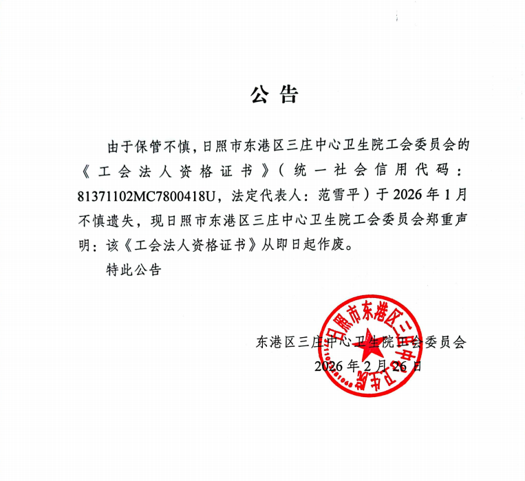 日照三庄中心卫生院工会法人资格证书不慎遗失。该院已按相关规定通过网络平台发布遗失公告,并向登记管理机关提交了工会法人资格证书补领申请表、遗失公告和说明材料,申请补发新证。该院郑重声明:原遗失的工会法人资格证书已失效,任何人不得使用该证书进行任何活动。该院将严格按照相关程序,尽快完成补办工作,确保工会工作正常开展。如有疑问,欢迎联系三庄中心卫生院。