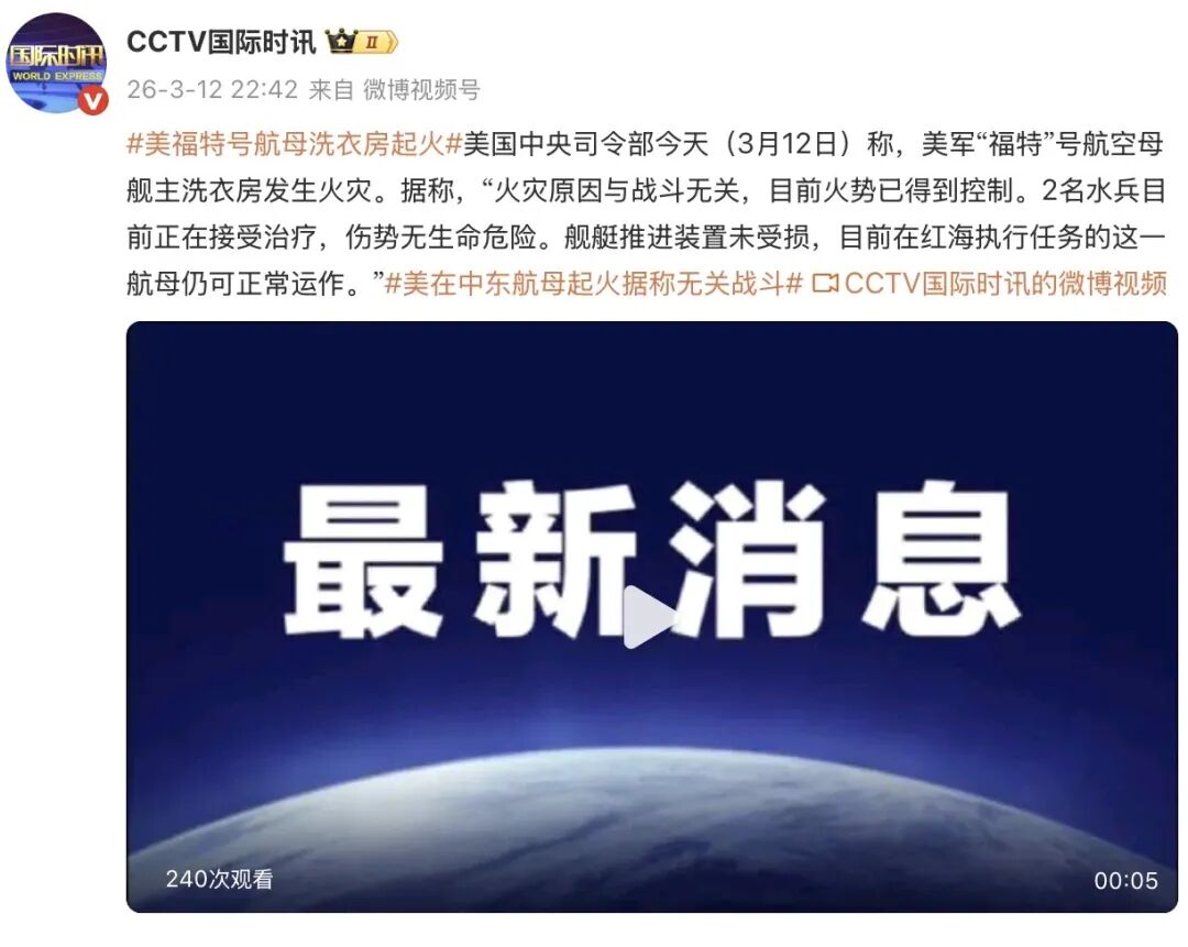 2026年3月12日,美国中央司令部发布官方通报,正在红海执行任务的美军"福特"号核动力航空母舰(CVN-78)主洗衣房发生火灾。通报确认:火灾原因与战斗无关,排除外部攻击;火势已得到控制,未发生蔓延;2名水兵接受治疗,伤势无生命危险;舰艇推进装置未受损,航母仍可正常执行任务。