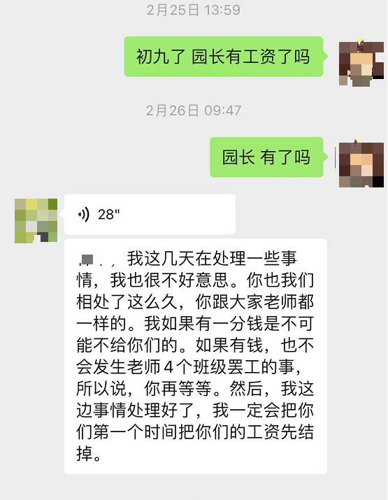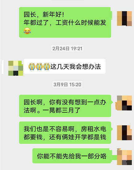 温州瓯海区一民办幼儿园因园长欠债已于本学期正式停办。该园长长期拖欠教师工资和社保,从2025年8月起就有教师发现社保被断缴。今年1月,教师开始向园长咨询工资发放,园长承诺"过几天就可以发出",但至3月仍未兑现。春节后园长仅回复"在想办法"。1月26日幼儿园宣布停办,园长承诺停办后会补齐工资和社保,称"这是做人的原则",但随后园内设备被全部搬空,园长不再出面回复。一位即将生产的女教师因社保断缴焦急不已,多名教师因工资长期不到位影响基本生活。教师们陷入维权困境,期待园长负责人早日出面妥善处理。