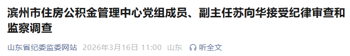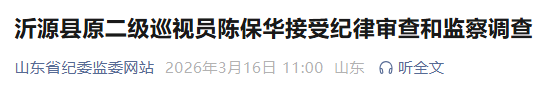 据淄博市纪委监委消息,沂源县原二级巡视员陈保华涉嫌严重违纪违法,目前正接受淄博市纪委监委纪律审查和监察调查。据滨州市纪委监委消息,滨州市住房公积金管理中心党组成员、副主任苏向华涉嫌严重违纪违法,目前正接受滨州市纪委监委纪律审查和监察调查。
