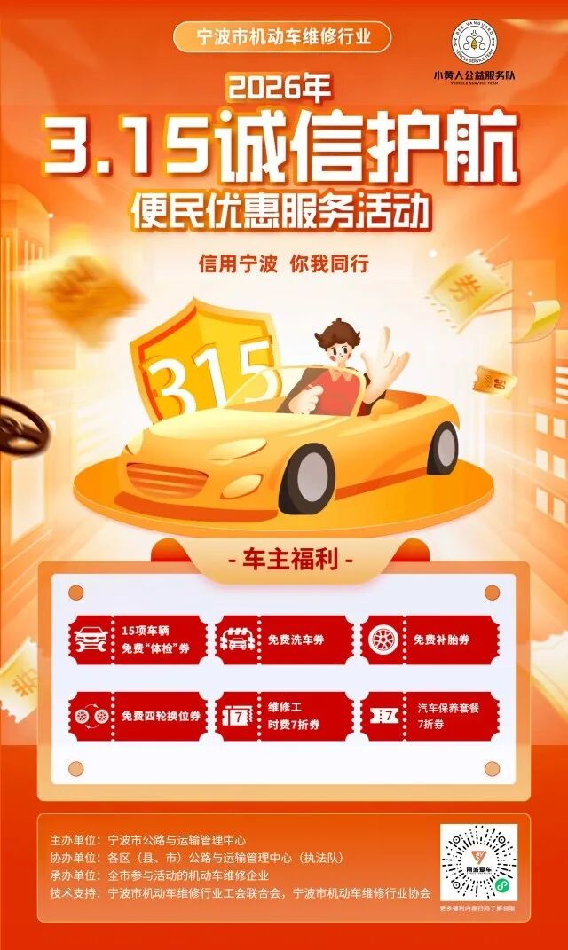 2026年3月15日至31日,宁波市启动"诚信护航"主题机动车维修行业公益活动。由市公路运输中心主办,全市符合条件的维修企业承办,覆盖整个"3·15"消费维权月。