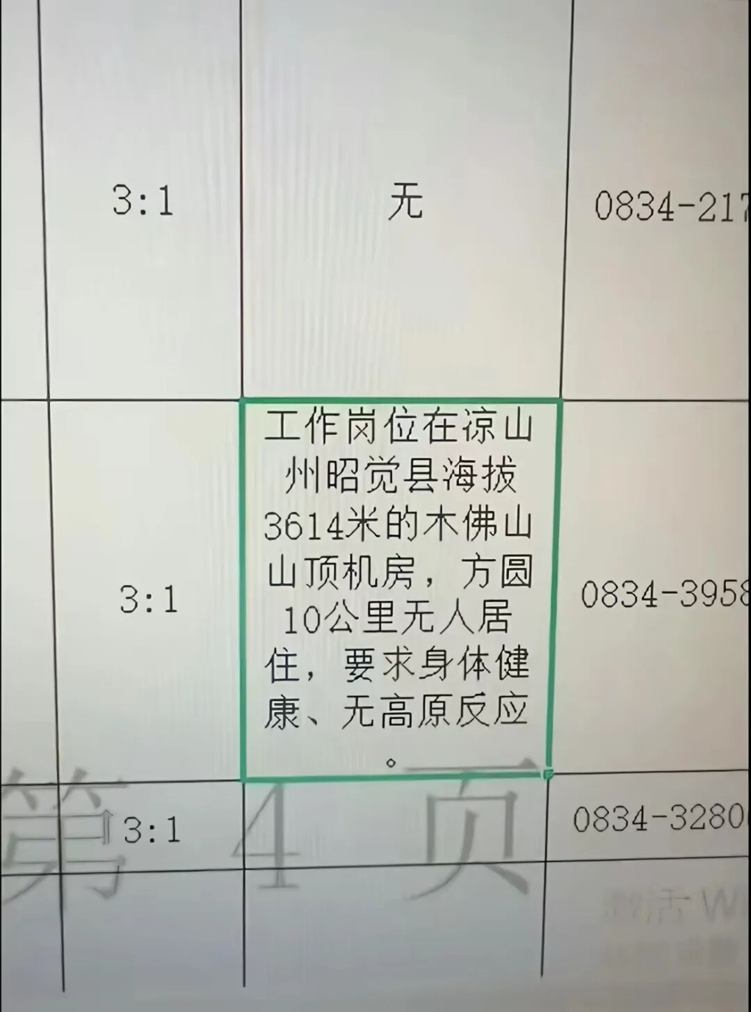 近日,四川凉山州木佛山广播电视转播台公开招聘"广播电视传输覆盖"岗位1人。招聘要求:34岁以下,本科以上学历。工作地点在凉山州昭觉县海拔3614米的木佛山山顶机房,方圆10公里无人居住,要求身体健康、无高原反应。