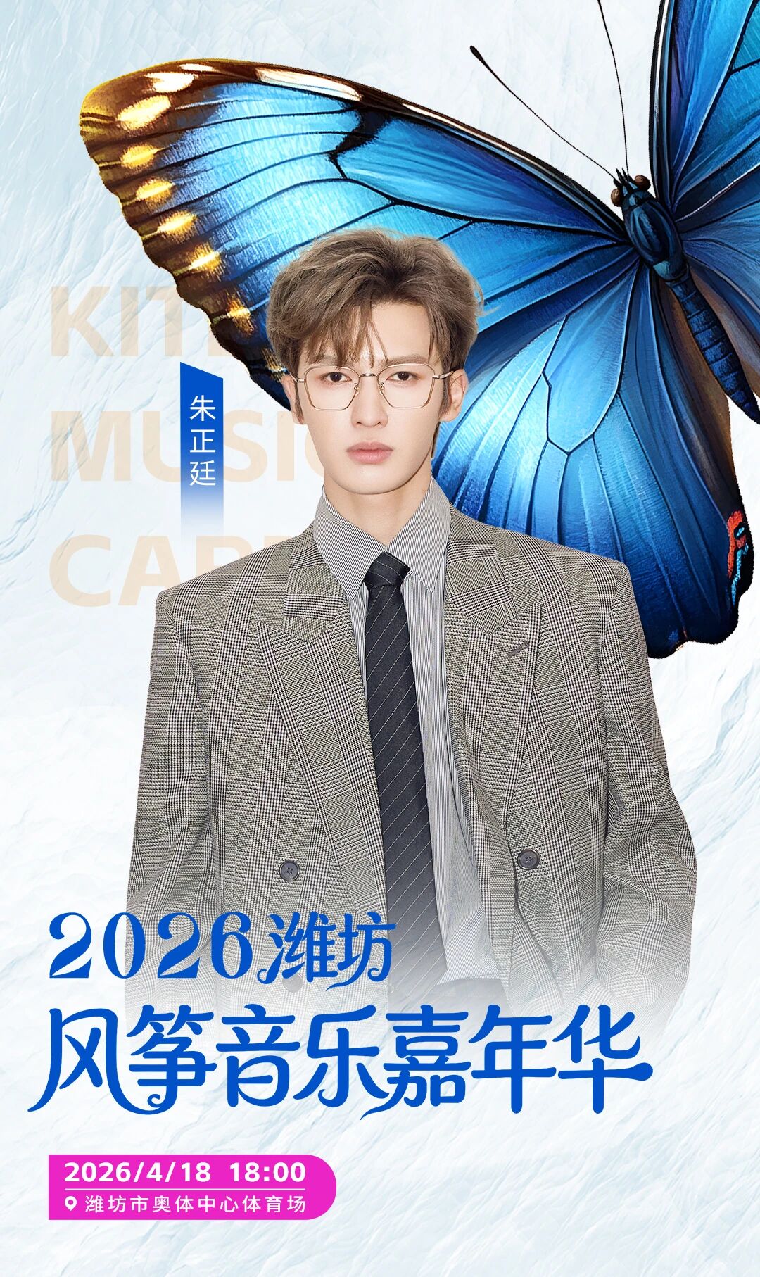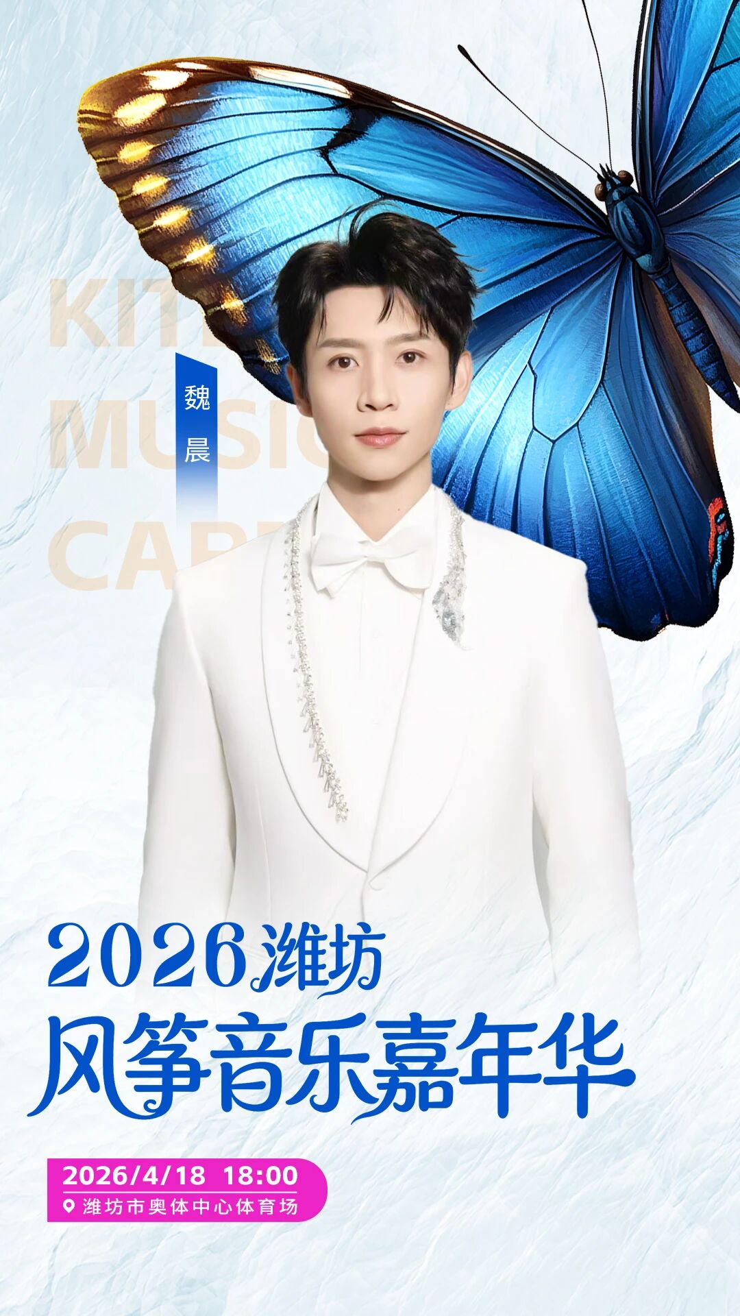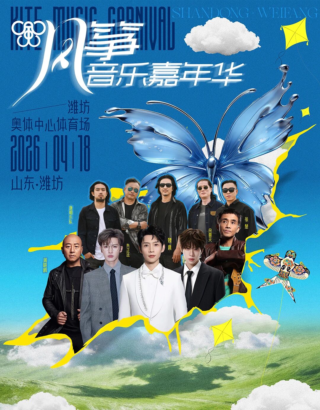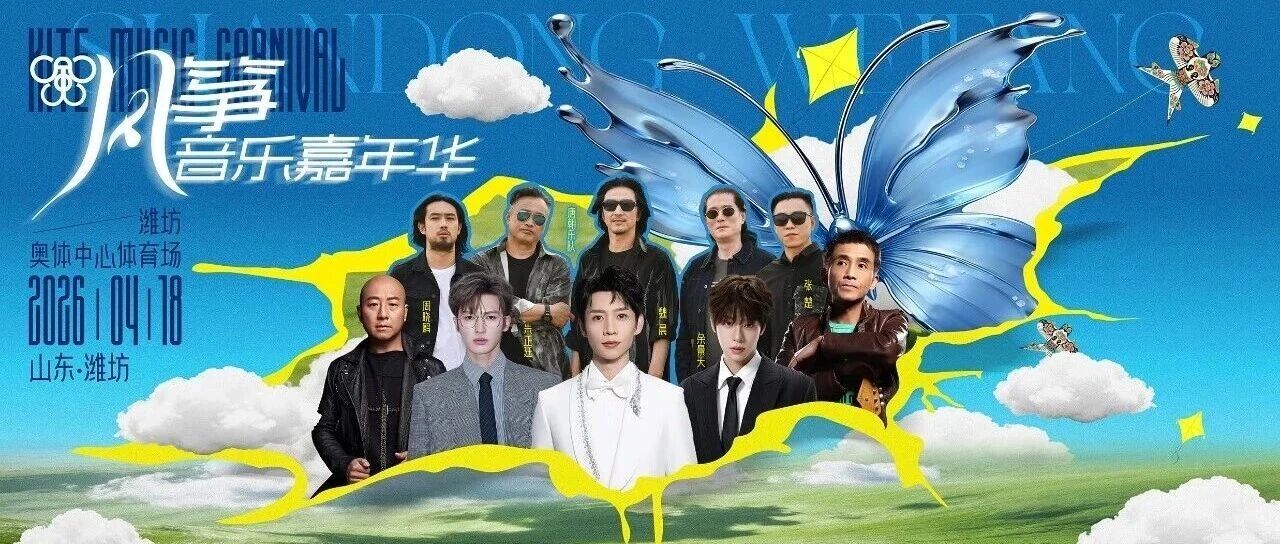 潍坊2026风筝音乐嘉年华定档4月18日18:00,在潍坊奥体中心体育场举行。演唱会汇聚摇滚界标杆与新生代力量,阵容包括魏晨、朱正廷、余景天、周晓鸥、唐朝乐队、张楚等艺人。