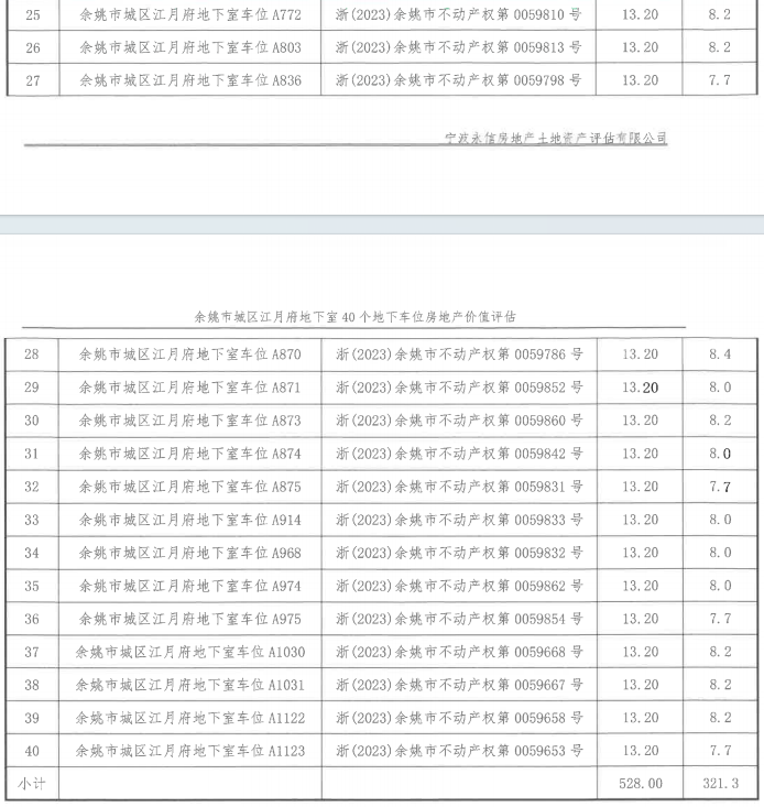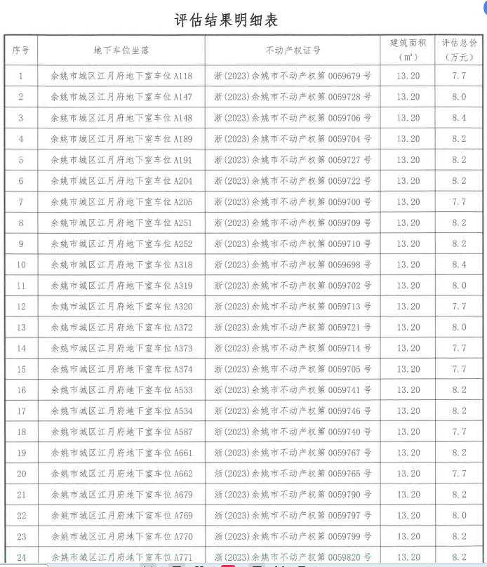 余姚一知名房地产开发企业因债务纠纷,名下位于江月府小区的40个地下车位被余姚市人民法院查封。这批车位总面积528平方米,市场评估总价321.3万元,均位于地下一层,每个建筑面积13.2平方米。评估单价在7.7万元至8.4万元之间,其中A148、A318、A870等车位评估价最高为8.4万元。车位已于2023年9月完成首次登记,土地使用期限至2090年3月。法院查封期限自2025年10月至2028年10月。被执行人涉及建设工程施工合同纠纷案件,执行标的额超180万元,已被限制高消费。购买限制为仅江月府业主可参与竞买。截至2025年12月12日,每个车位拖欠物业费276元,合计11040元,由买受人承担。参考车位A28起拍价4.8万元,实际起拍价往往低于评估价。这批车位将分批在拍卖平台上线。