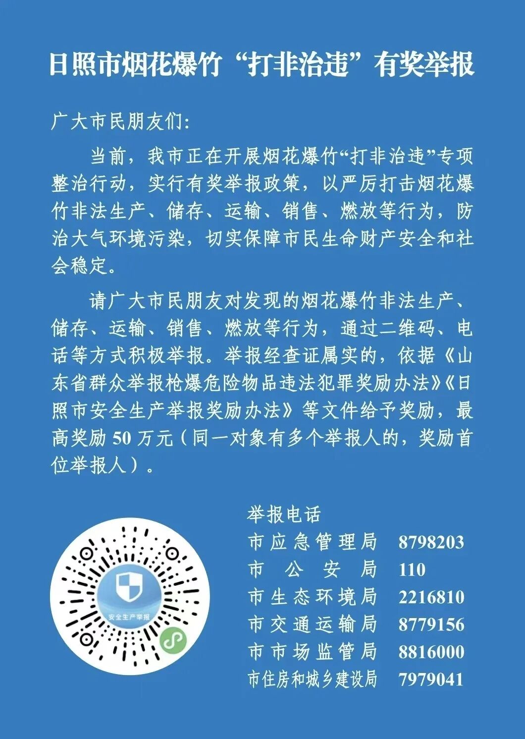 日照市正在开展烟花爆竹"打非治违"专项整治行动,严厉打击非法销售、储存、运输烟花爆竹等违法行为。为鼓励市民积极参与监督举报,当地实行有奖举报政策,最高奖励金额达50万元。