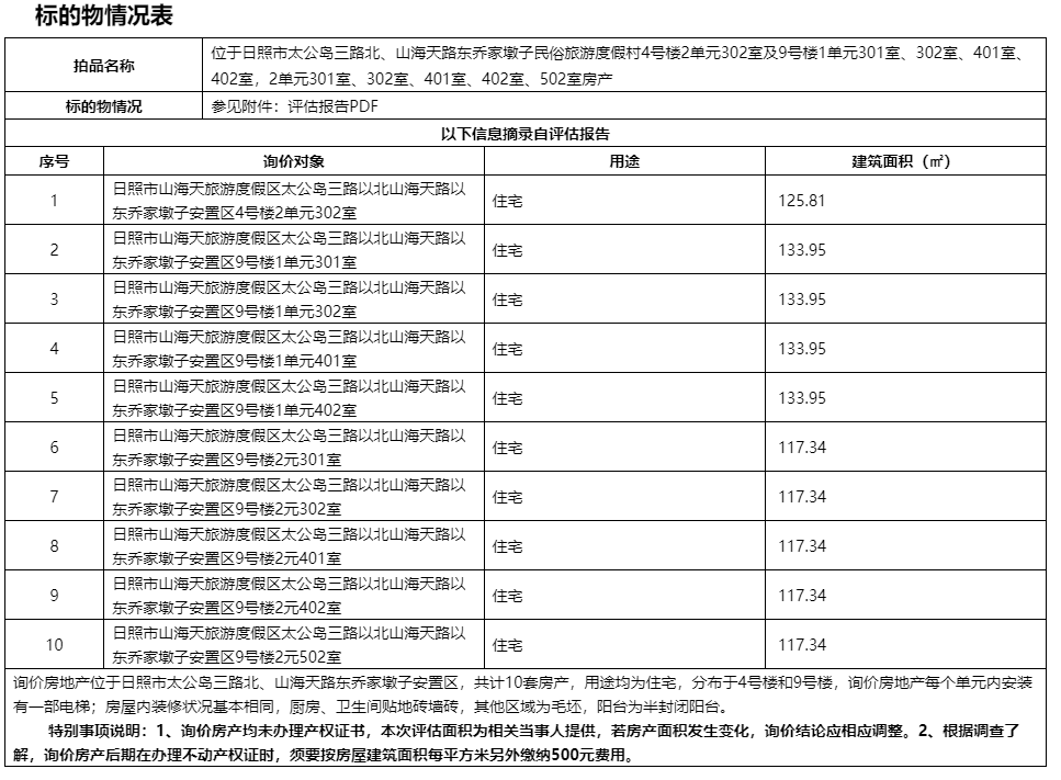 拍卖标的二:位于太公岛三路北、山海天路东乔家墩子民俗旅游度假村4号楼2单元302室及9号楼多套房产(共9套)。评估价5726500元,起拍价4008550元,保证金601282元。
