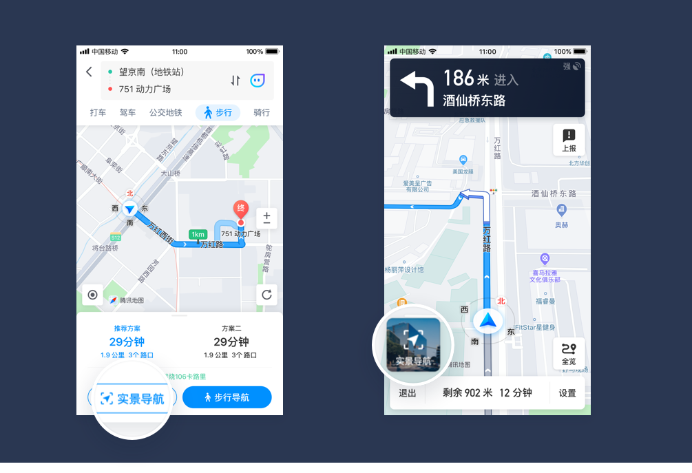 在腾讯地图App中,步行规划和导航页面都明确透出了AR实景导航功能入口。用户在步行场景下可以快速的进入实景导航。