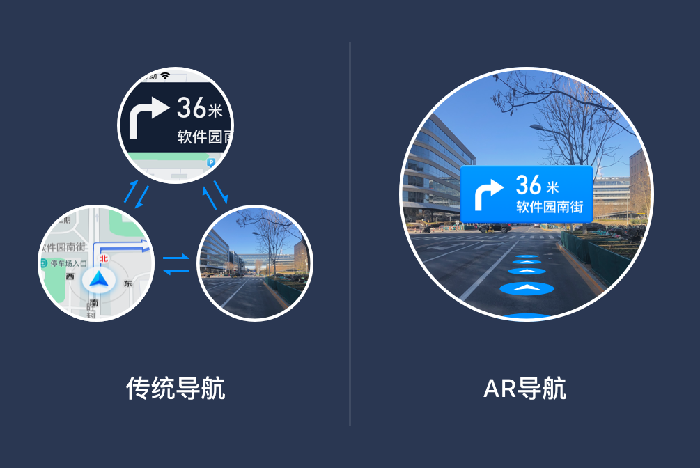 传统导航用户读图理解成本高,布局上以“抽象底图+诱导面板”的方式,在使用的过程中需要不断对照抽象底图、诱导面板和现实场景。尤其是步行的自由度较大,面临的道路环境也复杂多变,加上现有传感器精度不足、定位不准、朝向不对等多种因素,导致用户在某些场景下步行导航的体验不佳。