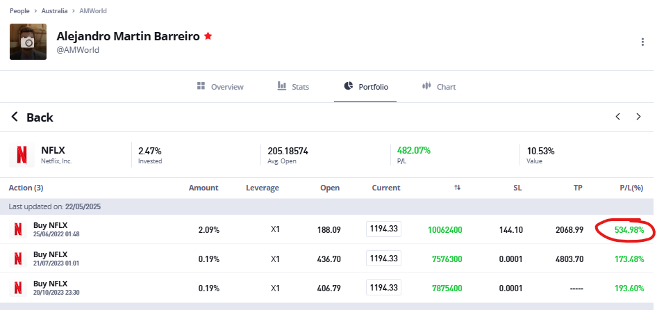 Aquí una captura de mi posición en Netflix dentro de eToro.