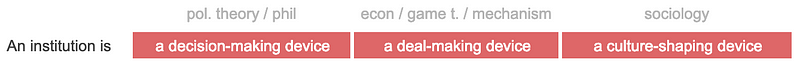 We'll practice looking at an institution through three lenses — as a decision-making device, a deal-making device and culture-shaping device. These lenses come from a variety of fields, including political theory, economics, game theory, mechanism design, social choice, game design, and sociology. Using them, non-experts can learn to make smart evaluations of institutional ideas quickly.