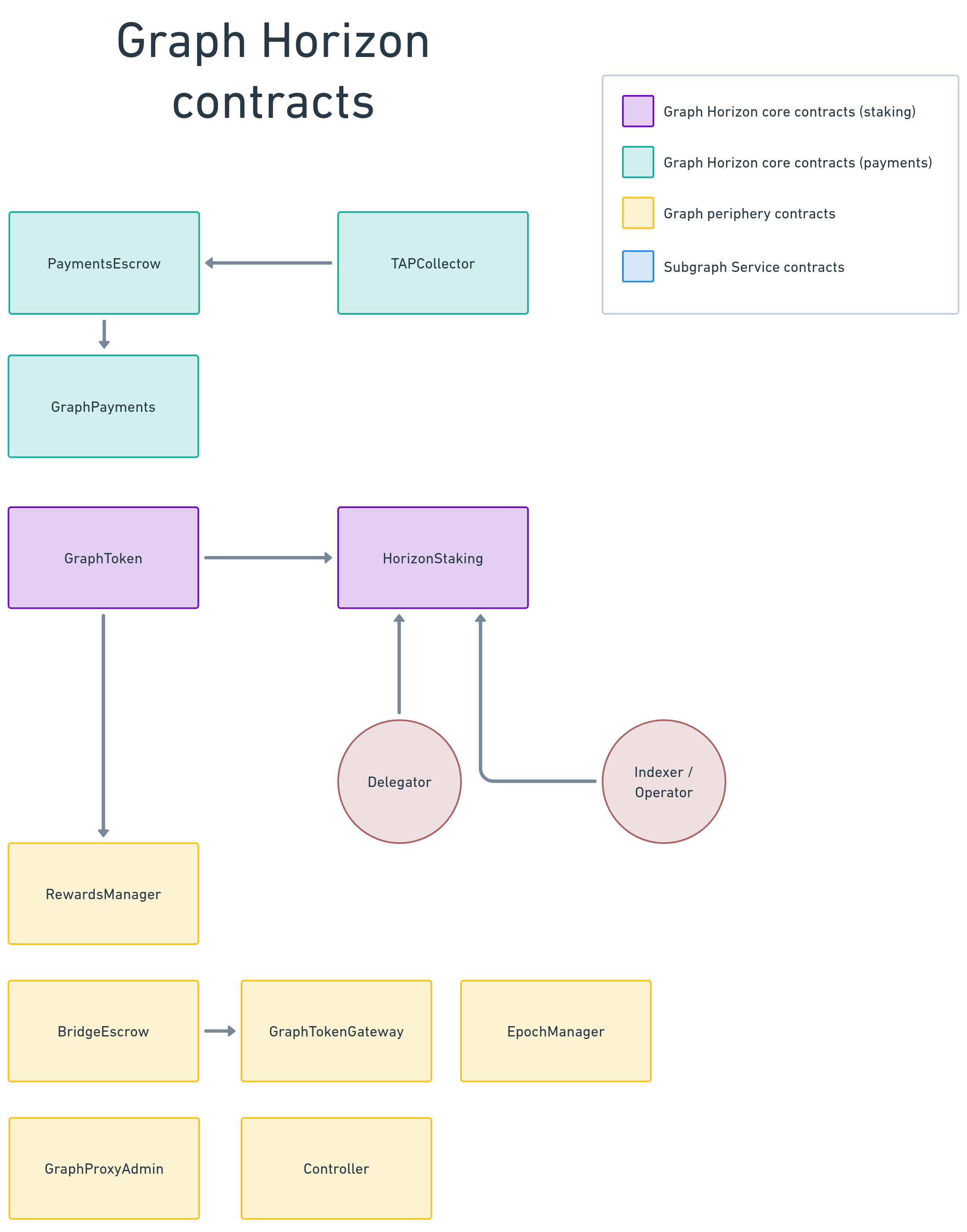 GraphToken: The GRT token contract. Not covered in this document as it’s an immutable ERC20 contract already deployed.HorizonStaking: Implements the staking protocol.IPaymentCollector: Interface for a payment collector implementation.PaymentsEscrow: Holds payer funds in the payments protocol.GraphPayments: Implements payment collection and distribution.RewardsManager: Issues GRT as rewards for approved data services.Curation: Signal GRT to subgraphs, indexing rewards are proportional to curation signal.BridgeEscrow and GraphTokenGateway: Custom Ethereum - Arbitrum bridge.EpochManager: Keeps track of epochs in the protocol.Controller and GraphProxyAdmin: Governance contracts.The staking protocol is the core of Graph Horizon. It provides the staking layer for data services to use as economic security and the primitives to build upon. The staking protocol is implemented by a single contract, HorizonStaking, which should have no external dependencies other than the GraphToken contract.
