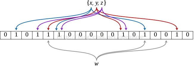 分别对 x、y、z 运算 hash 函数取得 bit mask,写到 Bloom Filter 结构中