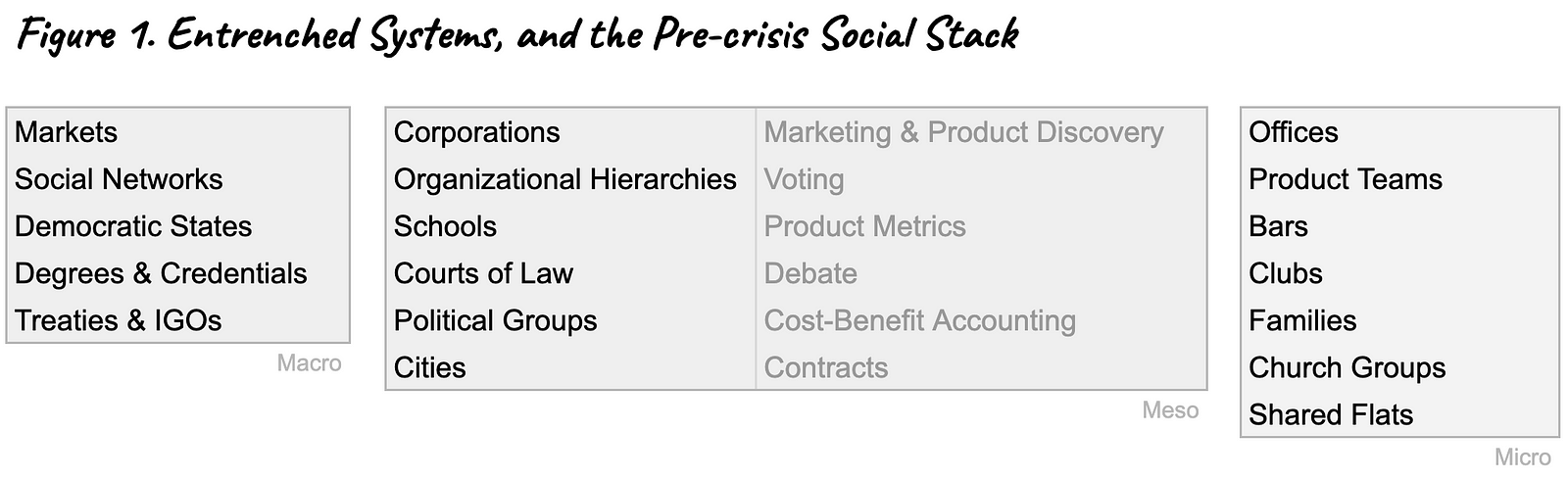In this essay, lots of things will be called social systems. When I use this term, I mean the kind of things in black text in figure 1: systems made of people, who have codified and mutually understood roles and responsibilities. If you mention that youâre part of one, and what your role is, people will understand.