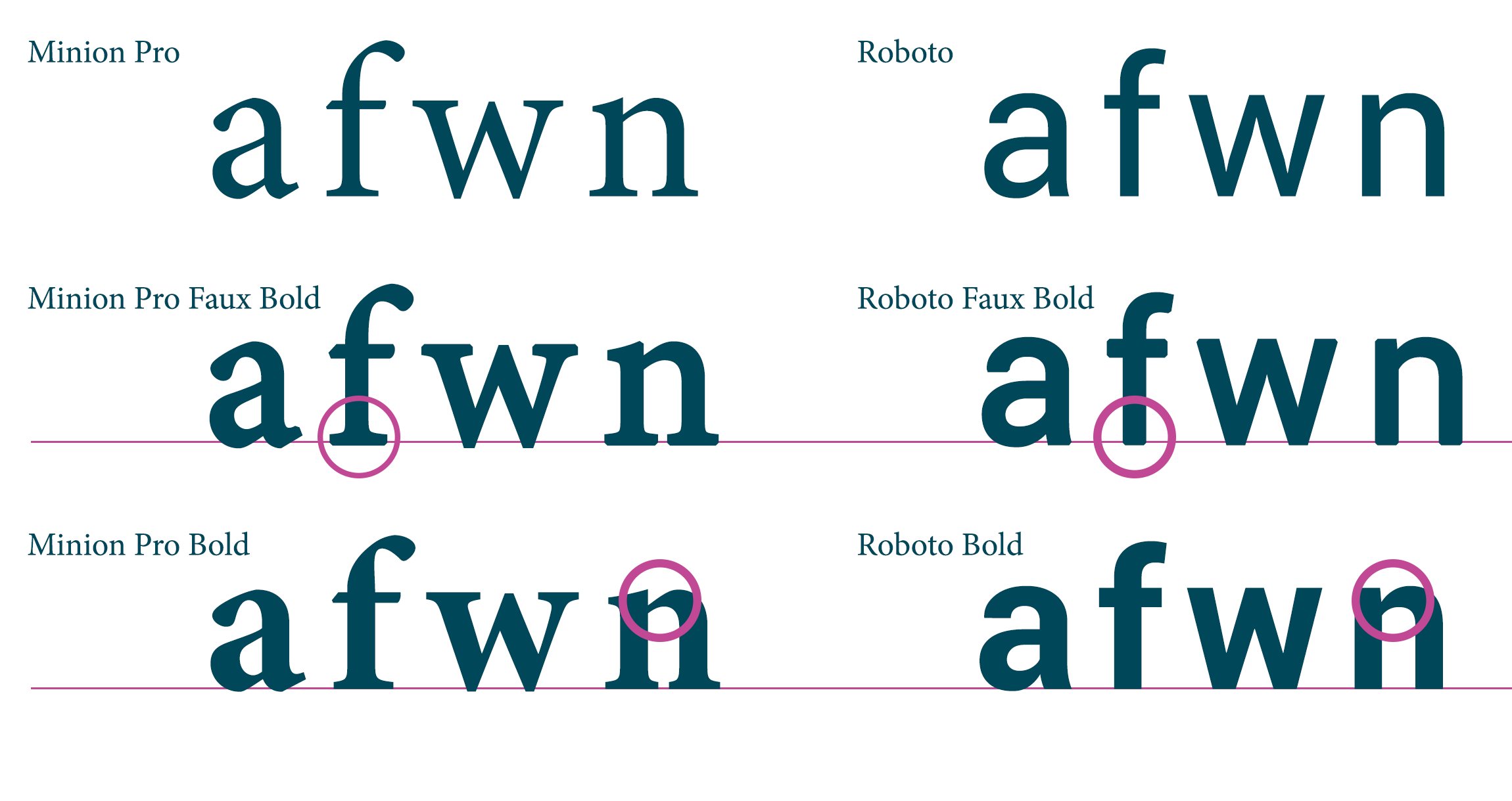 Example of differences between faux and real bold. source