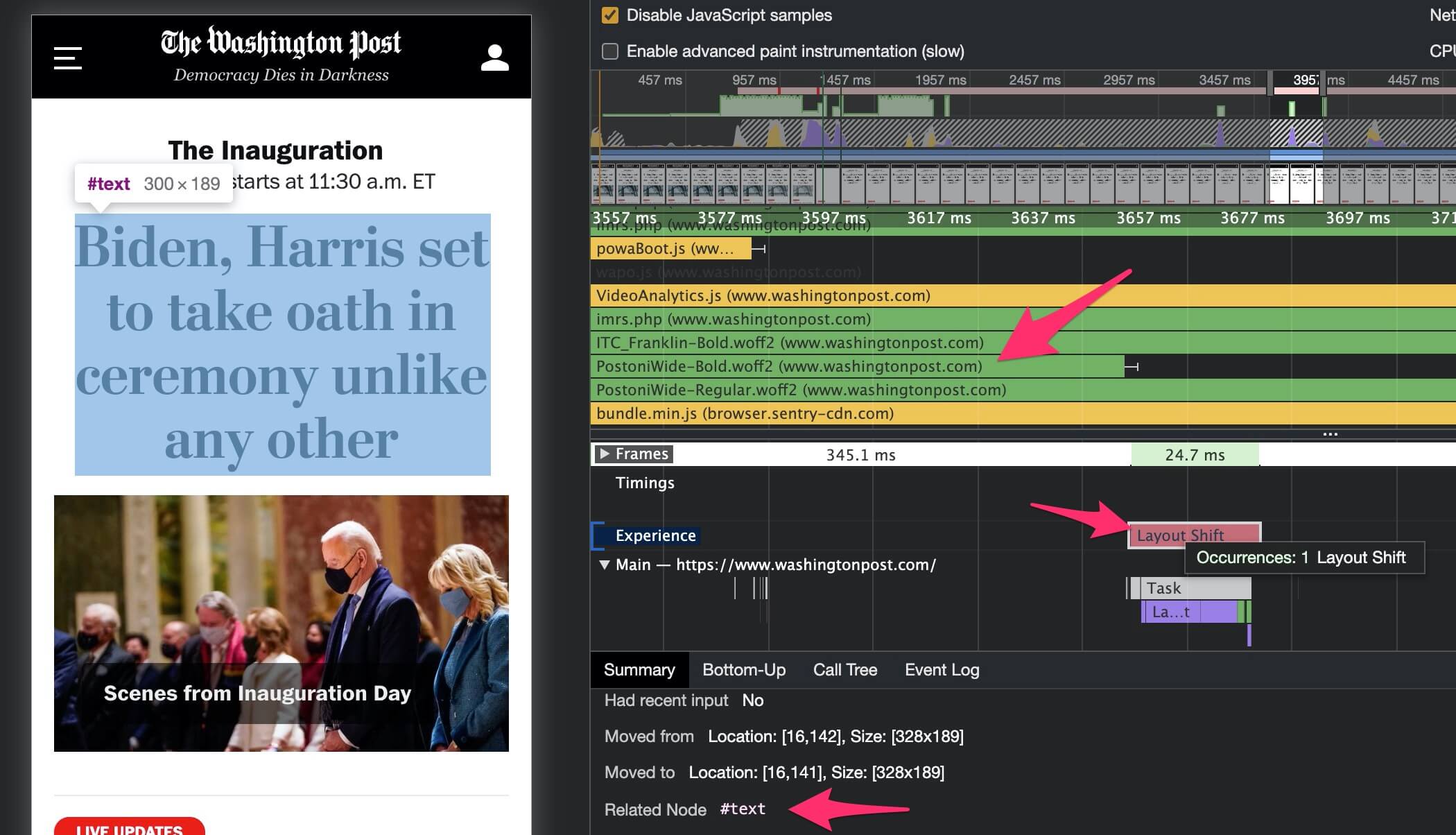 Chrome developer tools shows attribution of layout shifts