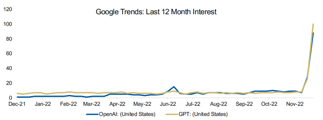图:随着11月底ChatGPT的发布,人们对OpenAI和GPT的关注度产生了巨大变化