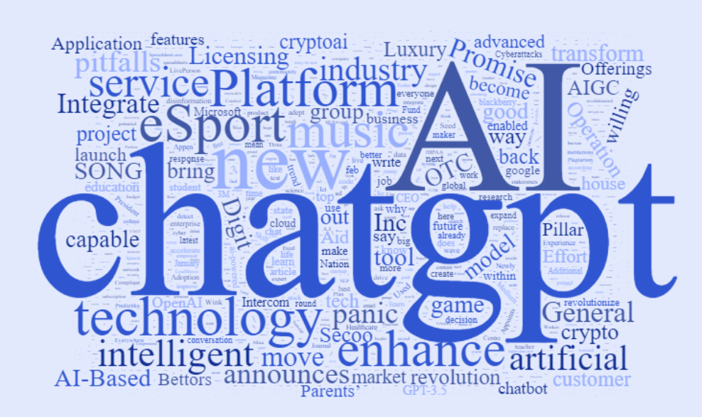 分析“ChatGPT+Branding”这对组合关键词,在词云中能发现:除了能联想到的AI、技术等常规关键词外,还能看到一些有趣的词:Panic、Music、eSport(电竞)。对ChatGPT的评价词也普遍积极:New、intelligent、enhance、good、revolution。
